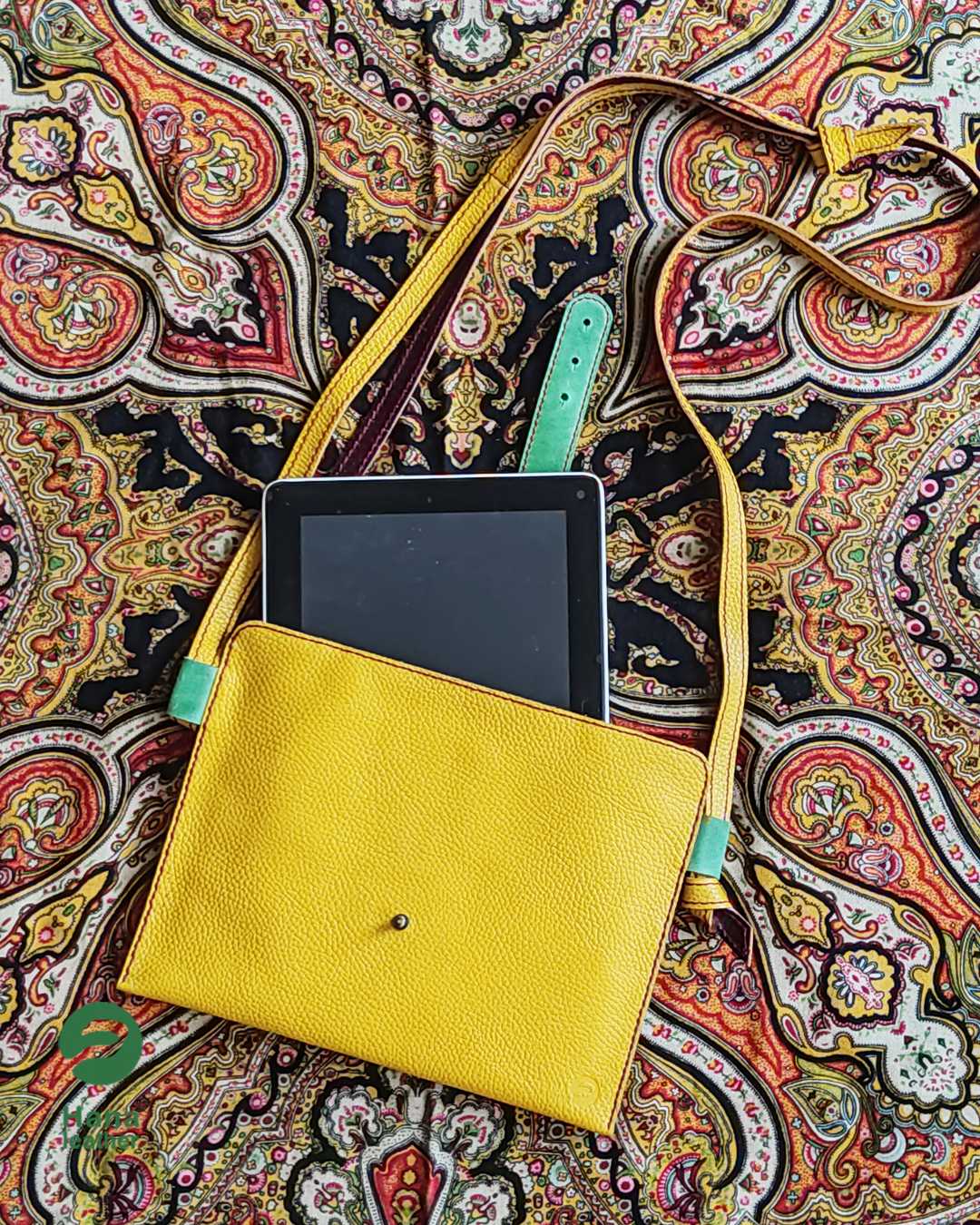 کیف دوشی تبلت چرمی. یک جیب بیرونی. یک جیب داخلی بسته شدن در توسط دکمه مگنتی است. بند قابل تنظبم